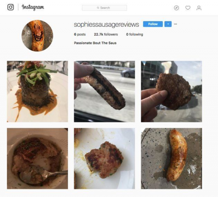 En la cuenta @sophiessausagereviews, inaugurada a principios de abril, la intérprete de 22 años se dedica a colgar fotografías de las salchichas que prueba y a ponerles nota. Por ejemplo, en la primera publicación comentó: "Londres, Inglaterra. Una clásica Cumberland. Jugosa al morderla. La piel no muy dura. Del tamaño de mi dedo corazón: perfecta. Sin embargo, me hubiera gustado que la piel fuera un poco más crujiente. Resultado: 7 sobre 10".