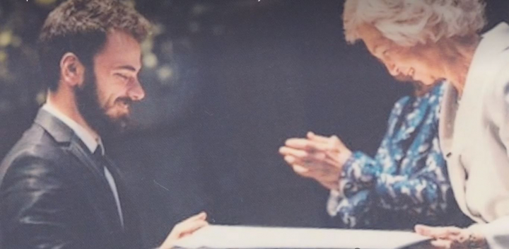 Pero, entre todas ellas, destaca una en la que un joven Pablo, con barba, aparece junto a la reina Sofía, que le está entregando un diploma.