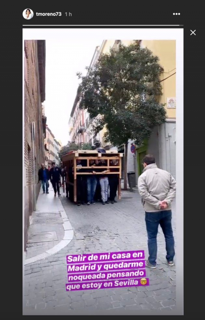"Salir de mi casa en Madrid y quedarme noqueada pensando que estoy en Sevilla", ha escrito sobre las imágenes de un vídeo que ha compartido en los stories de Instagram, en las que se ve el ensayo de un paso en procesión.