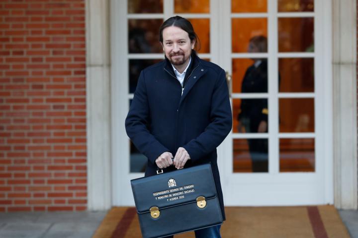 La pose de Pablo Iglesias, el nuevo vicepresidente segundo, ministro de Derechos Sociales y Agenda 2030, fue de las anécdotas más comentadas en Twitter. El líder de Unidas Podemos, cartera en mano, abrió las piernas para la imagen que se tomaron uno a uno mientras llegaban.