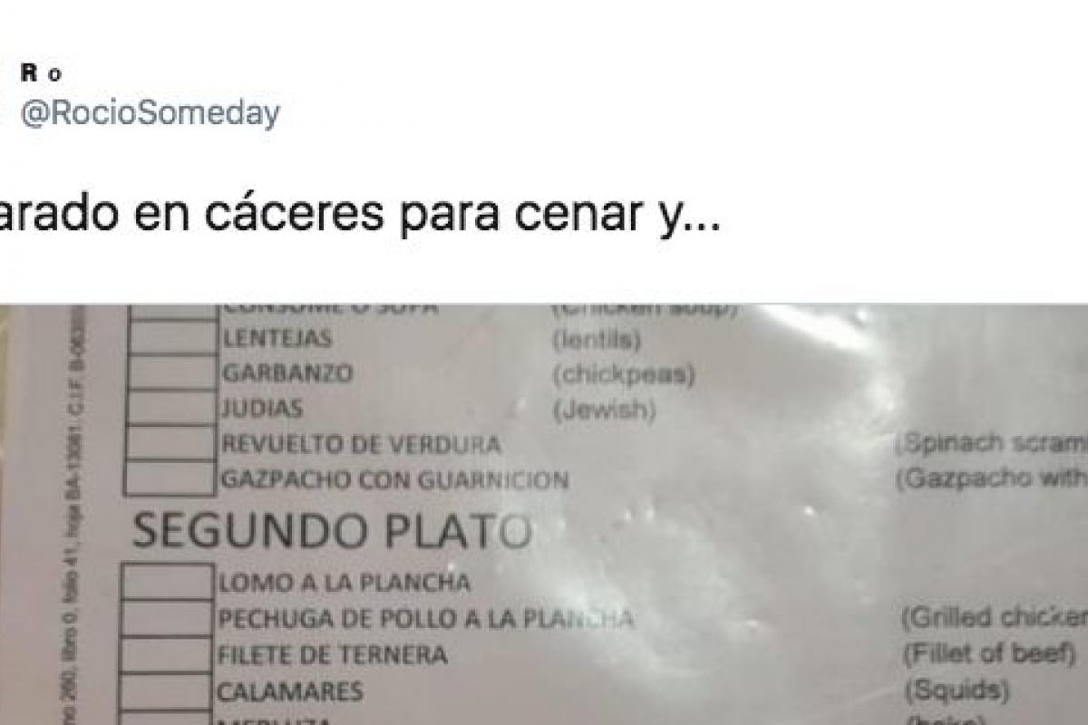 Buen ejemplo es la carta de un restaurante de Cáceres que compartió este martes la usuaria de Twitter @RocioSomeday y que, en menos de dos días, acumula más de 13.700 me gusta. La imagen habla por sí sola.