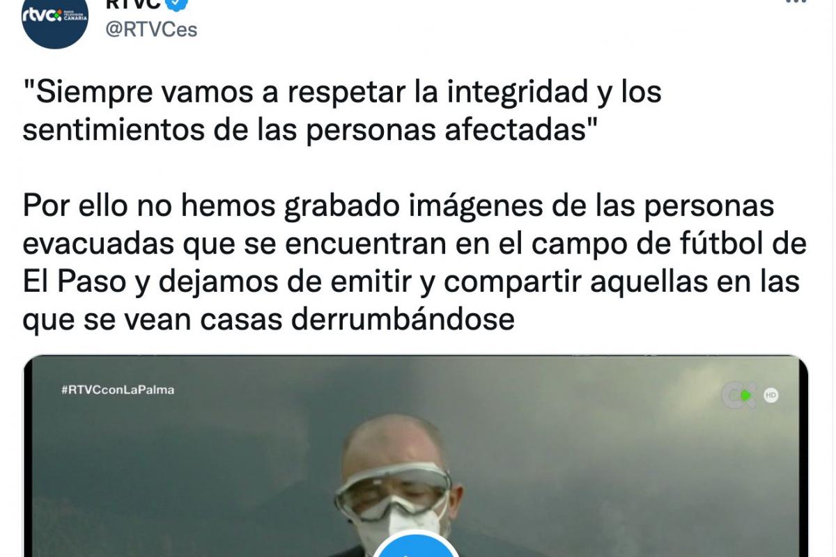 “Por ello no hemos grabado imágenes de las personas evacuadas que se encuentran en el campo de fútbol de El Paso y dejamos de emitir y compartir aquellas en las que se vean casas derrumbándose”, han escrito en Twitter.