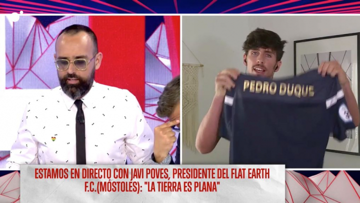 Para finalizar la entrevista, Poves ha sacado una camiseta de su equipo de terraplanistas con el nombre de Pedro Duque, astronauta y ministro de Pedro Sánchez, como “abonado número uno”, del equipo.