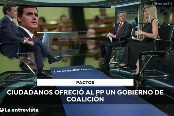 Albert Rivera ha sido entrevistado este lunes en Antena 3. Justo después del informativo, el líder de Ciudadanos se ha sometido a las preguntas de Vicente Vallés y Sandra Golpe y ha protagonizado un momento de tensión con los dos periodistas.