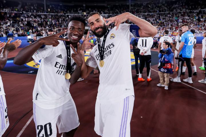 Vinicius y Benzema celebran el título del Real Madrid en la Supercopa de Europa de este veranoSoccrates Images via Getty Images