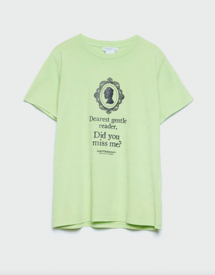 Para los más fans de la serie, la marca ha lanzado una serie de camisetas con frases célebres de Los Bridgerton o con los nombres de los protagonistas estampados junto a flores en tonos lilas.
