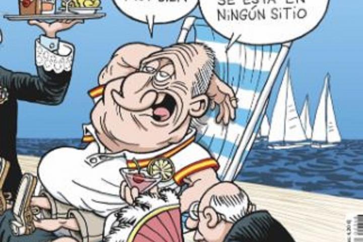 En esa primera plana aparece dibujado el rey emérito junto al titular: “El bribón ha vuelto”. Juan Carlos I está junto al mar y varios jueces aparecen sirviéndole: uno le trae bebidas, otro agachado le sostiene las piernas y el último le abanica.