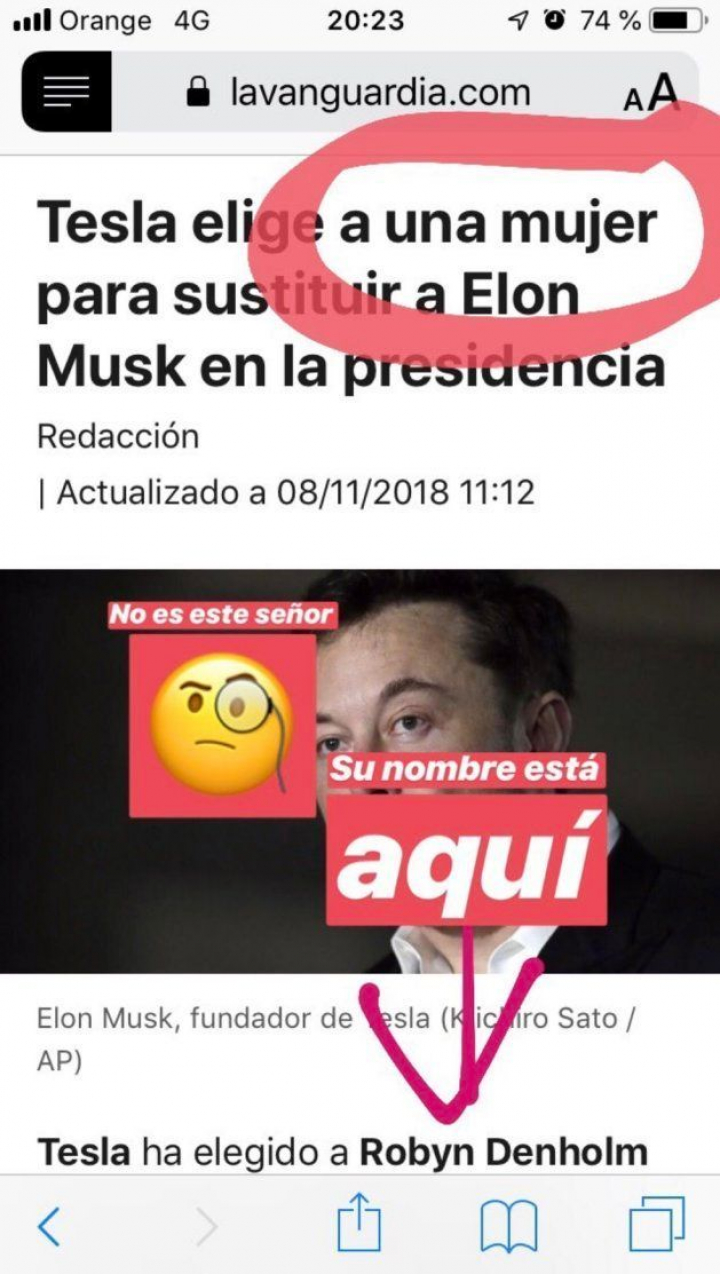 "Tesla elige a una mujer para sustituir a Elon Musk en la presidencia", decía el encabezado original junto a una imagen del expresidente de la compañía.