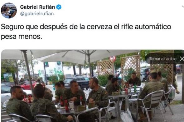 El diputado de ERC Gabriel Rufián compartió el pasado sábado una imagen de un grupo de militares tomando, entre otras bebidas, unas cervezas en una terraza. Los integrantes van vestidos con los trajes oficiales y llevan varias armas de gran tamaño.