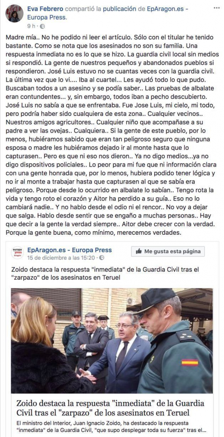 Eva Febrero ha criticado en su perfil de Facebook las carencias en el medio rural, así como la ausencia de información tras el tiroteo ocurrido el 5 de diciembre en Albalate del Arzobispo (Teruel). Según ella, la Guardia Civil respondió "sin medios", al igual que su marido y otros vecinos, "gente de nuestros pequeños y abandonados pueblos".