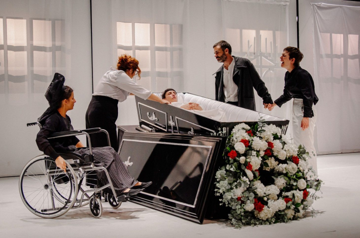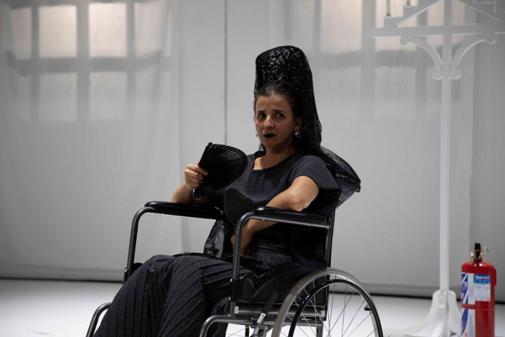 La casa, en principio, solo es un espacio rectangular blanco sobre el suelo hasta convertirse en un gran salón con paredes. Unas paredes que los actores mueven y colocan en escena con una naturalidad pasmosa creando el lugar en el que se producirá el drama y la comedia. Pues, aunque la obra se toma en serio, o precisamente por eso, también provoca risas.