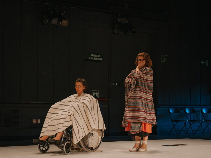 Obra hecha para que se vea el cartón del teatro. No solo por cómo se construye el espacio escénico. Un espacio escénico que comienza contrastando la vida en la calle, la real, y la vida teatral, la ficcional.