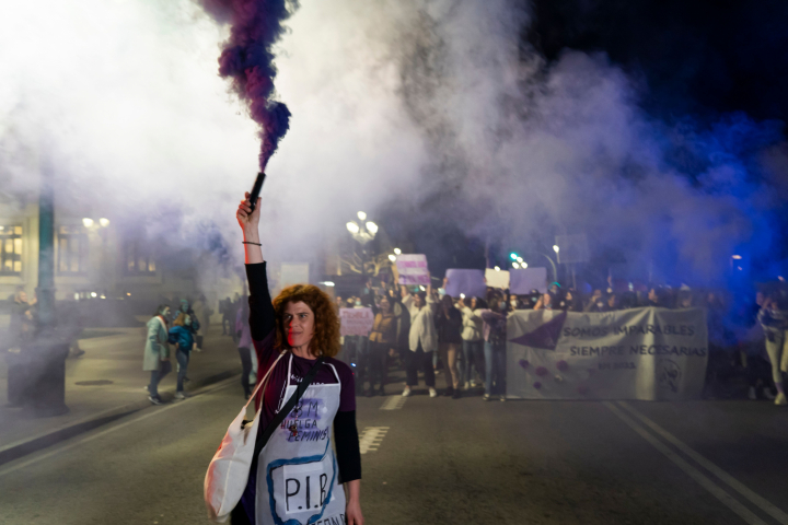 Con una bengala morada, un delantal por la huelga feminista, una bolsa de tela cargada al hombro y la mirada fija al frente, esta mujer atrajo al objetivo de la cámara en la última manifestación del 8 de Marzo en Santander. Firme, sonriente y seria al mismo tiempo, parecía gritar ‘no nací mujer para morir por serlo’ o ‘¡que viva la lucha de las mujeres!’. “Más feminismo para menos guerra”, decía otro de los carteles de este 8M. Porque si hay que declarar la guerra, que sea al patriarcado y al machismo que impregnan nuestra sociedad.