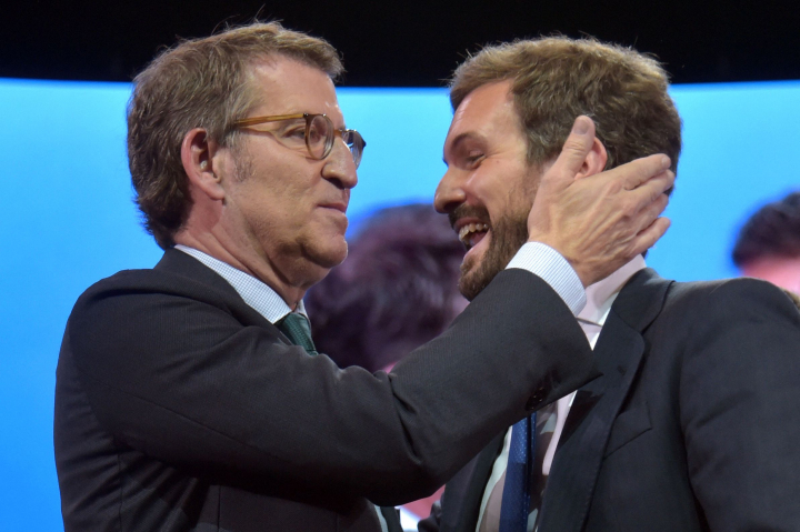 ¿Saludo, palmada o pescozón? No se distingue bien del todo el gesto que sale de Alberto Núñez Feijóo hacia su antecesor en el cargo de secretario general del PP, Pablo Casado. Aquel 2 de abril se firmaba la sentencia de este último y la entronización del primero. Fue en Sevilla, en el Congreso Nacional Extraordinario del PP, donde Núñez Feijóo fue elegido con un 98,35% de los votos y Casado anunció que dejaba su escaño. Lo demás –las acusaciones de corrupción al hermano de Ayuso, las manifestaciones contra el ‘traidor’ de Casado y en favor de la madrileña, la coalición con Vox para gobernar Castilla y León…– es ya historia.