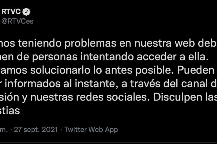 La noche de este lunes RTVC ha vuelto a protagonizar un momentazo en Twitter. “Estamos teniendo problemas en nuestra web debido al volumen de personas intentando acceder a ella. Esperamos solucionarlo lo antes posible. Pueden seguir informados al instante, a través del canal de televisión y nuestras redes sociales. Disculpen las molestias”, publicaron en su cuenta de la red social del pájaro azul.