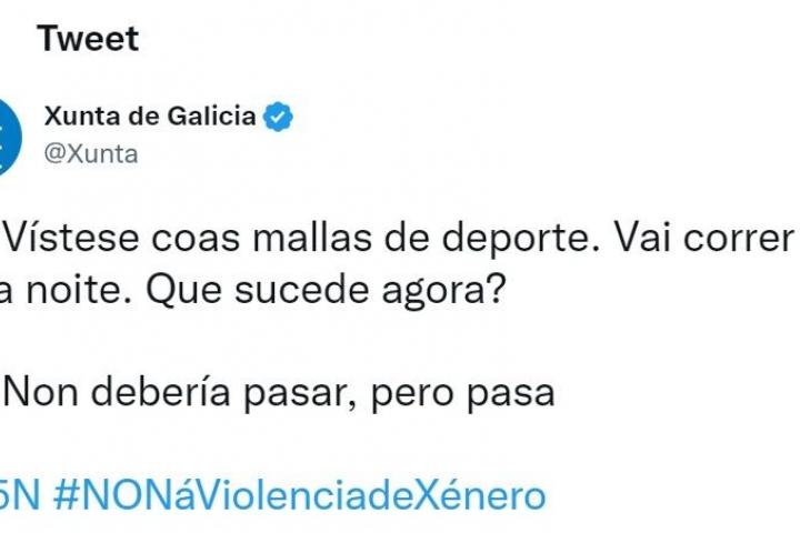 La Xunta de Galicia ha mostrado la campaña usada para este 25 de noviembre y ha indignado a muchas personas. “Te vistes con mallas de deporte. Vas a correr por la noche. ¿Qué sucede ahora? No debería pasar, pero pasa”, recoge la iniciativa.