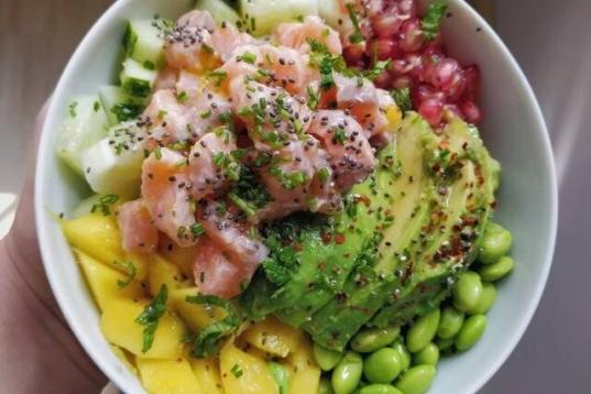 Ingredientes: salmón fresco, mango, algas wakame, aguacate, arroz especial para sushi.Para el aliño: vinagre de arroz, aceite de sésamo, salsa de soja y semillas de sésamo.Consulta la receta en Cookpad