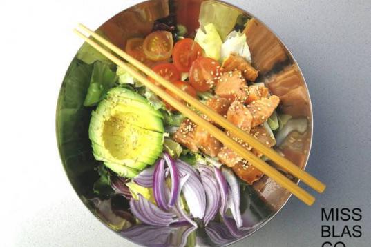 Ingredientes: 100 gramos de lechugas variadas, 100 gramos salmón fresco marinado,1/2 aguacate, 5 tomates cherry, 50 gramos cebolla morada, semillas de sésamo tostadas, salsa de soja y aceite de oliva v...