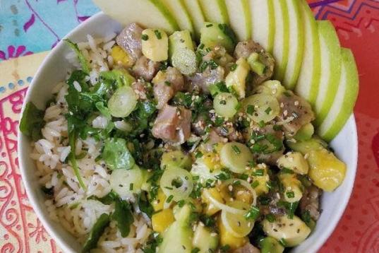 Ingredientes: 200 gramos de arroz cocido, 200 gramos de atún, un mango, un aguacate, un pepino, una manzana ácida, cebolleta, rúcula y jalapeños.Para el aliño: lima, salsa de soja, jengibre, chile, sésam...