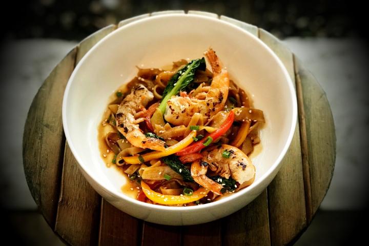 Langostinos salteados con pasta de arroz y vegetales