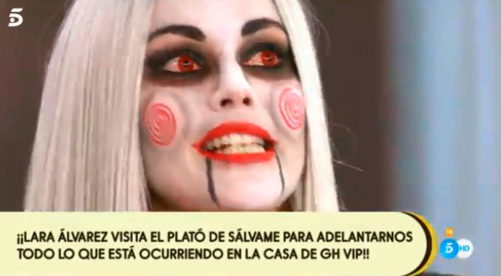 La gran sorpresa la ha dado Lara Álvarez, presentadora de la última hora de Gh Vip, que se ha presentado en el plató de Carlota Corredera vestida de Jigsaw o Puzzle, el protagonista de las macabras películas de Saw.