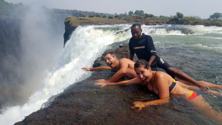 The Devils Pool es una piscina natural situada en el borde del precipicio de las Cataratas Victoria. Una vez que has sorteado las resbaladizas piedras y te has sumergido en la piscina,enfrente tienes un bonito abismo de más de 100 metros de caía. No siempre podrás bañarte en esta piscina. Si el río Zambeze trae mucha agua se prohibe. La enorme fuerza con la que baja el río en época de lluvia te arrastra sin remedio al precipicio.