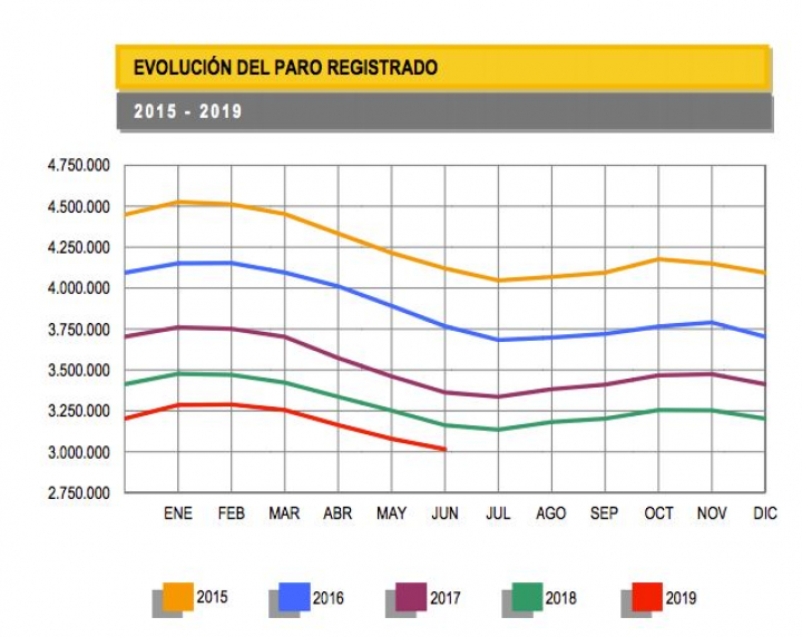 Si junio suele ser un buen mes para la creación de empleo, también lo suele ser para la caída del desempleo. El número de parados registrados en las oficinas de los Servicios Públicos de Empleo ha bajado en 146.476 personas respecto a junio de 2018, lo que supone una reducción del 4,63%. Si se compara con el mes pasado, el desempleo ha disminuido en 63.805 personas en junio. Lo que supone un descenso del 2,07% respecto a mayo.