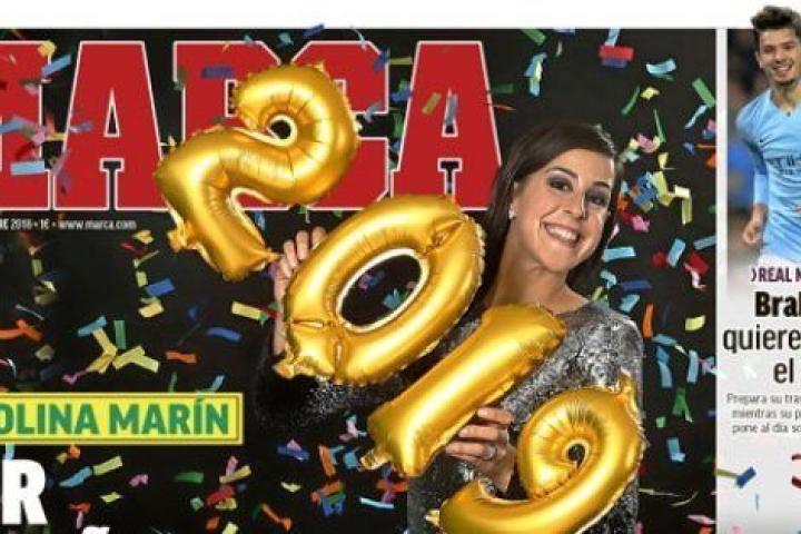 La jugadora de bádminton Carolina Marín protagoniza la portada del diario Marca este lunes. María José Rienda, exesquiadora, secretaria de Estado para el Deporte y presidenta del Consejo Superior de Deportes, hace lo propio en As. Los periódicos han recurrido a estas dos importantes mujeres del deporte español para felicitar el año nuevo.