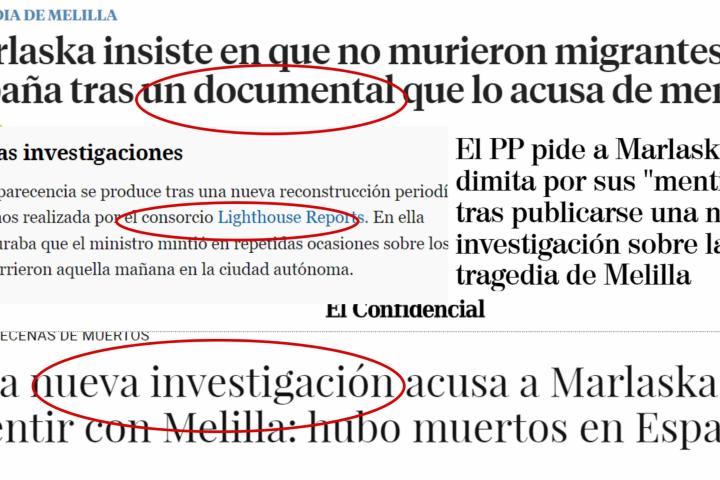 Por su parte, en un artículo de la cabecera de Jordi Juan titulado “Marlaska insiste en que no murieron migrantes en España tras un documental que lo acusa de mentir” se menciona “un nuevo trabajo periodístico conocido hoy”, pero en ningún caso se cita al medio al que pertenece dicha labor periodística. En su defecto, se habla de “varios medios de comunicación bajo el consorcio de Lighthouse Reports”.