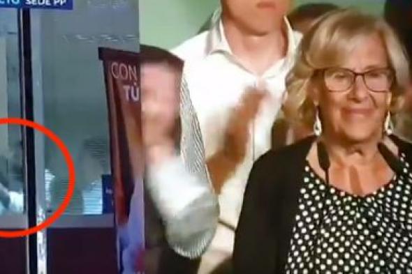 Las cámaras de televisión han captado como un miembro del PP hacia un corte de mangas en el interior de la sede del PP en la calle Génova mientras hablaba la alcaldesa de Madrid, Manuela Carmena.
