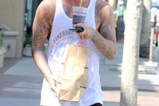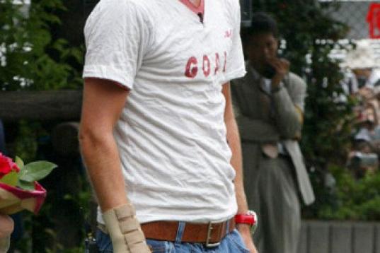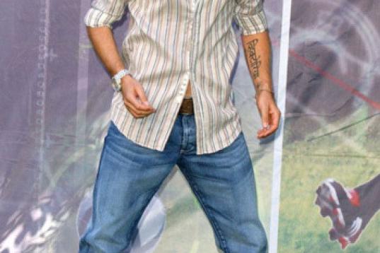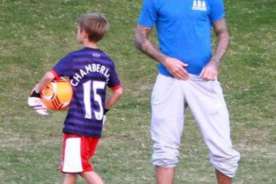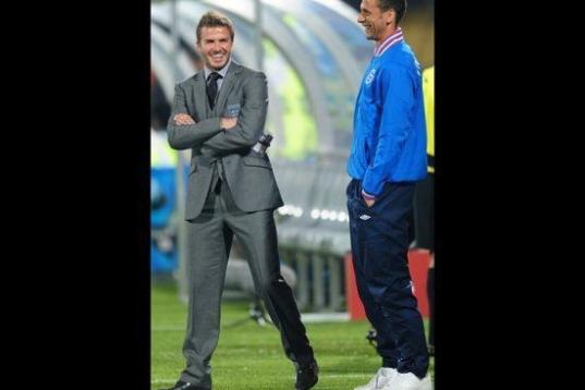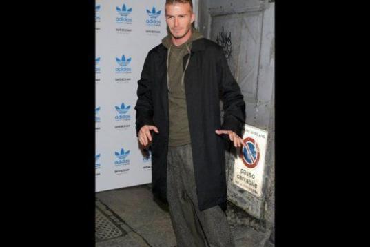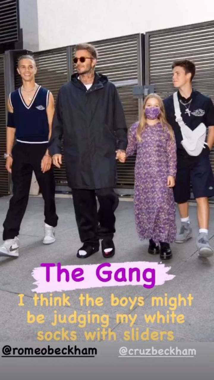 ¡David Beckham lleva chanclas-zapatillas de estar por casa con unos impecables calcetines blancos! Una combinación más que atrevida con la que él mismo ha bromeado.