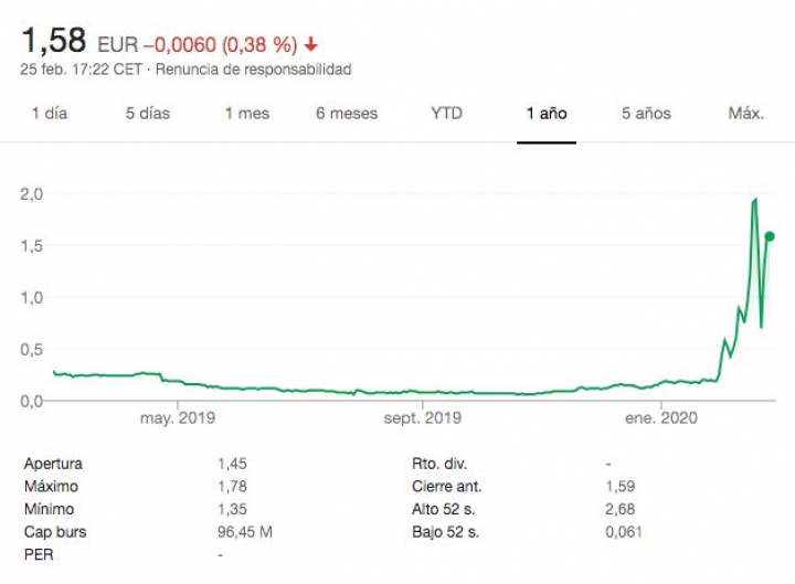 Las acciones de esta compañía tenían un valor de apenas 29 céntimos hace un año. Estas alcanzaron su punto más alto el 19 de febrero de 2020, tras la primera muerte por el virus en Europa y unos días antes de la oleada de casos de Italia. Ese día los títulos cerraron en los 1,91 euros, un 500% más.