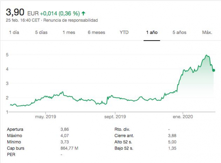 Las acciones de esta compañía, que cotiza en el mercado continuo, alcanzaron su punto álgido el 12 de febrero, tras la confirmación de un segundo caso en España, un ciudadano británico en Palma. Los títulos subieron ese día hasta rozar los cinco euros, un 238,10% más que hace un año, cuando estaban en 1,46 euros.