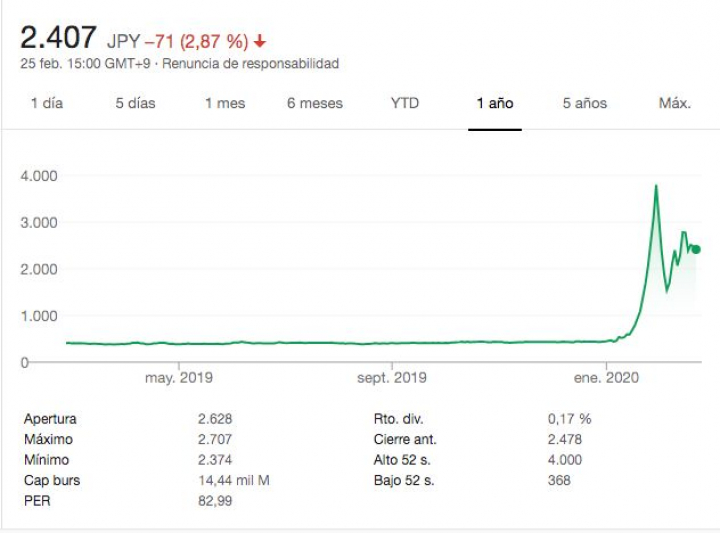 Los títulos de la empresa nipona han subido un 827%, ya que pasaron de costar 409 yenes (3,42 euros) el 26 de enero de 2019 a los 3.795 yenes (31,70 euros) el pasado 31 de enero, cuando alcanzaron su valor más alto.