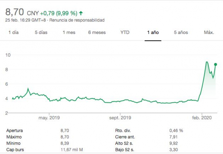 Los títulos de esta empresa china costaban 3,86 yuanes (0,51 euros) hace un año el 26 de enero de 2019. Alcanzaron su punto álgido el pasado 10 de febrero cuando se dispararon hasta los 9,04 yuanes (1,18 euros).