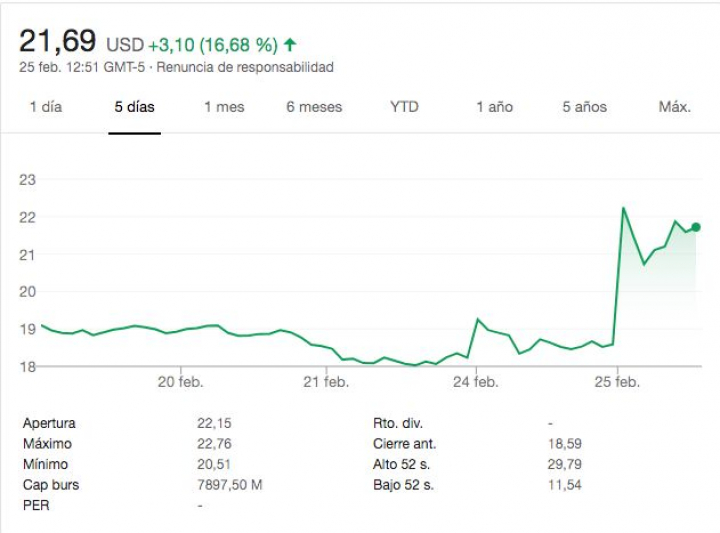 Los títulos de esta compañía, que cotiza en el Nasdaq, subían en torno al 17% hasta situarse en los 21,69 dólares por acción este martes al cierre de este artículo.