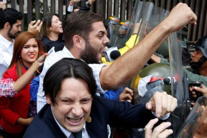 Diputados opositores chocan contra uniformados a las puertas de la Asamblea venezolana.CARLOS GARCÍA RAWLINS / REUTERS