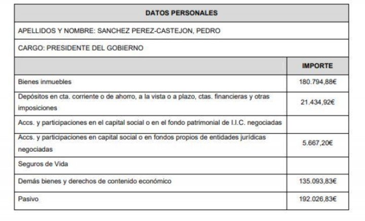 El presidente del Gobierno, Pedro Sánchez, ha declarado un patrimonio de 180.794 euros en bienes inmuebles y un pasivo (créditos, préstamos y deudas) por importe de 192.026 euros.