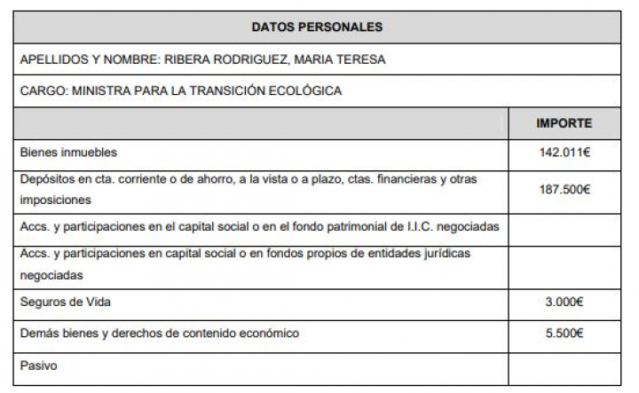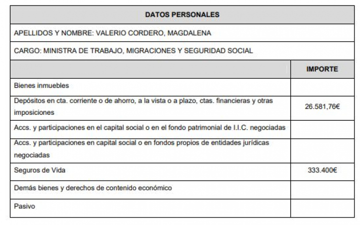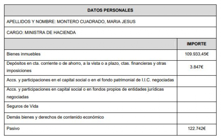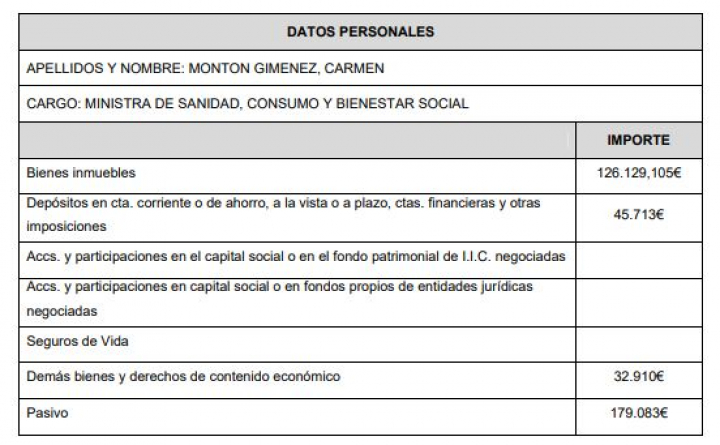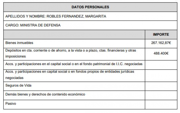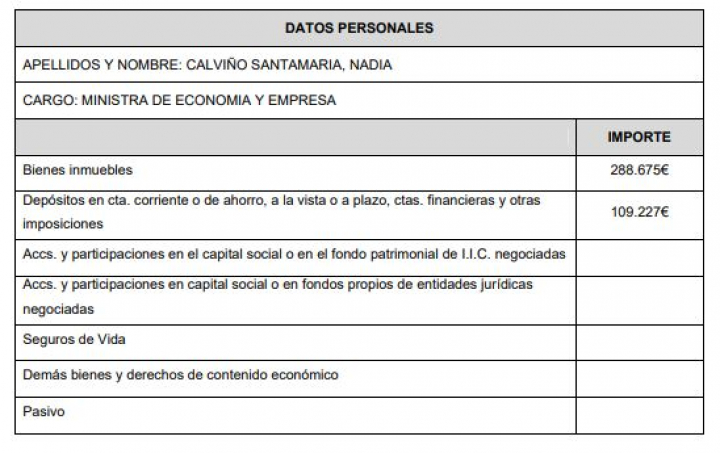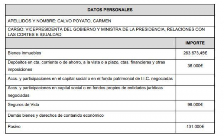 La vicepresidenta del Gobierno, Carmen Calvo, declara 263.673,45 euros en bienes inmuebles y un pasivo de 131.000 euros. Además, Calvo cuenta con 96.000 euros en seguros de vida y 36.000 en depósitos y cuentas corrientes.