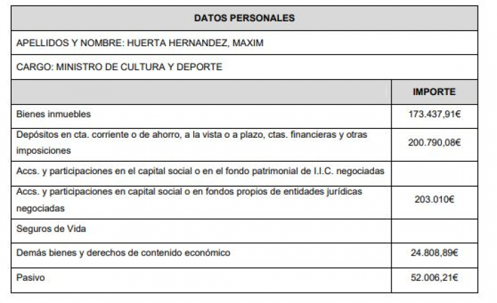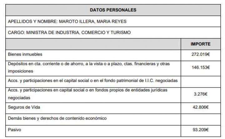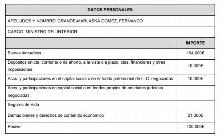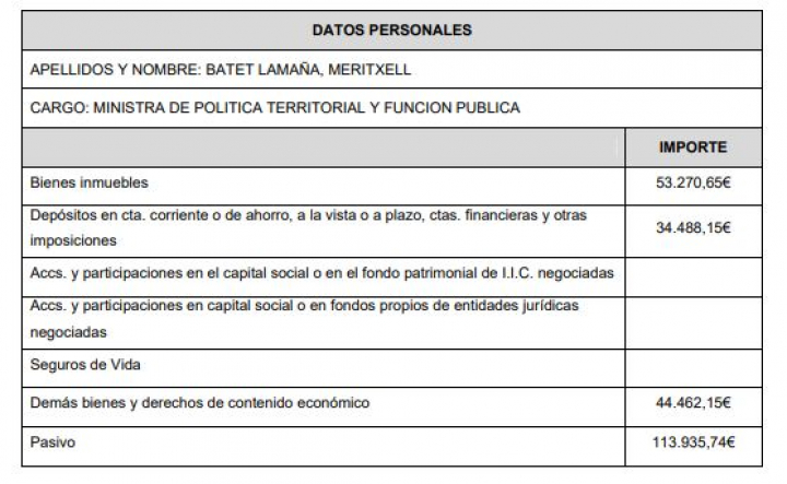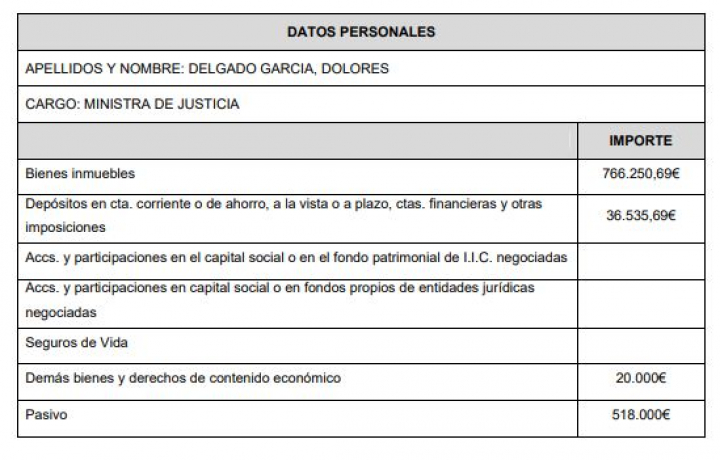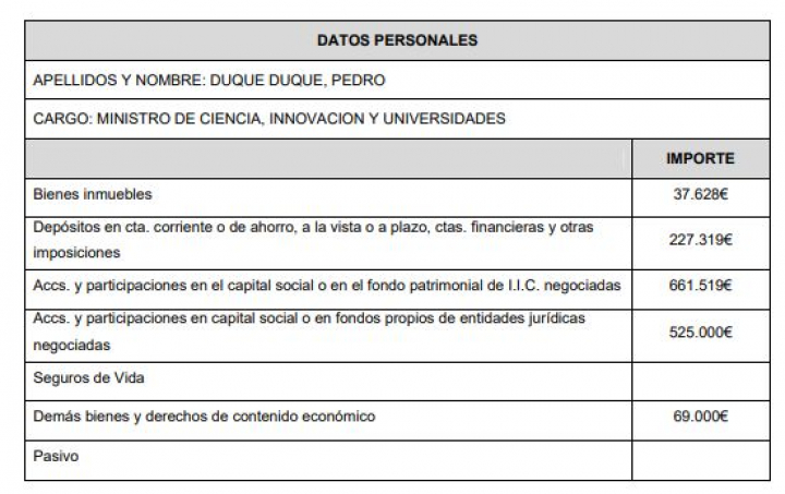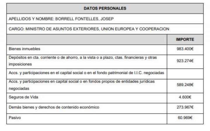 El titular de Exteriores, Josep Borrell, declara casi un millón de euros (983.400) en bienes inmuebles, así como 923.274 euros en cuentas corrientes. También tiene más de medio millón de euros (589.248) en acciones y participaciones, 4.600 euros en seguros de vida y 273.967 euros en otros bienes económicos. Además, cuenta con un pasivo de 60.969 euros.