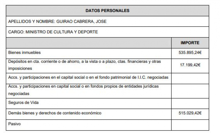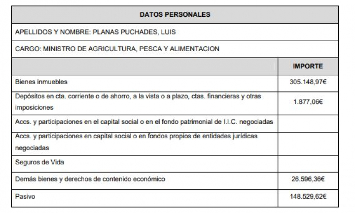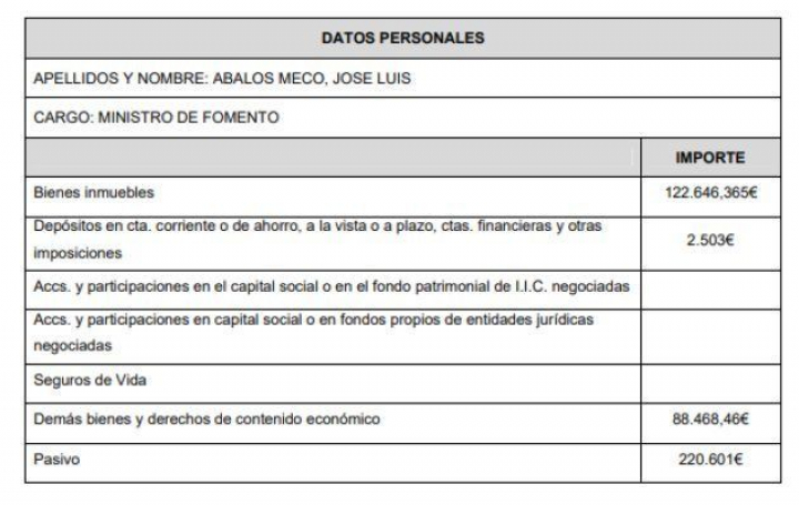 José Luis Ábalos, ministro de Fomento, declara 122.646,365 en bienes inmuebles, con un pasivo de 220.601 euros. Pero cuenta con 2.503 euros en cuentas corrientes y 88.468,46 en otros bienes de índole económica.