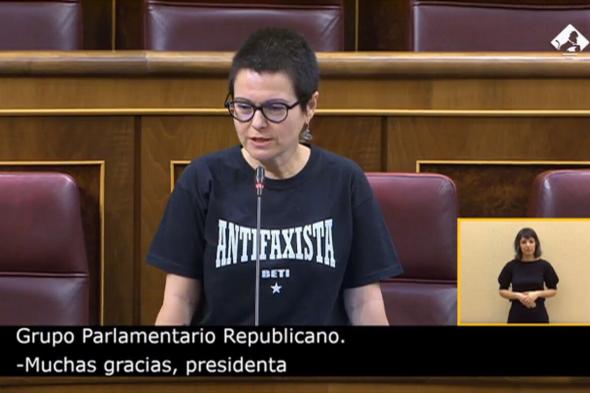 Maria Carvalho Dantas ha ido al Congreso con una camiseta negra en la que se podían leer junto a una estrella dos palabras: Antifaxista en grande y, justo debajo, Beti (Siempre, en euskera) en pequeño.