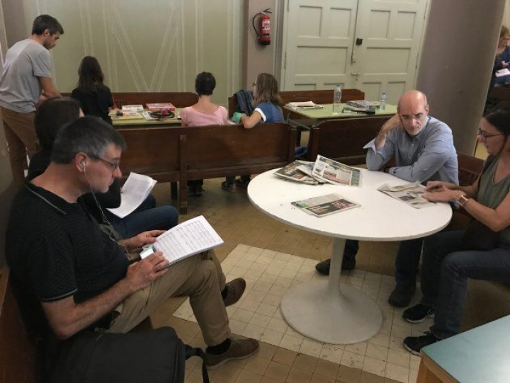 Muy cerca está el instituto Miquel Tarradell. También recibieron el viernes la visita de los Mossos. Al final han logrado pasar la noche casi treinta personas. En el vestíbulo algunos padres juegan con sus hijos, un hombre repasa una partitura. A todos los que entran les pregunta quiénes son. Se han desplazado hasta aquí vecinos de otros barrios también, que confiesan que lo han hecho para ayudar a que se abra el colegio, al haber muchos padres inmigrantes "menos concernidos".