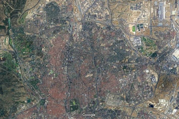 En la de Madrid, obtenida por la Estación Espacial Internacional, se puede apreciar la distribución de las avenidas con una marcada Castellana. También se distinguen perfectamente las luces de los municipios aledaños y la oscuridad de la sierra o de las zonas más rurales.