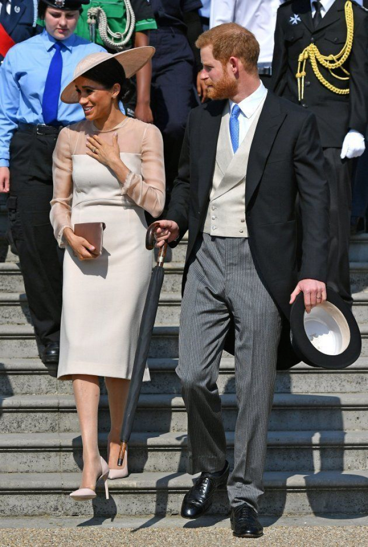 Markle ha lucido un vestido corto —acorde para este tipo de fiestas llamadas garden parties— en tono empolvado, con trasparencia en la parte superior y en las mangas, y sombrero del mismo color. Para completar su look, la duquesa de Sussex ha llevado una cartera metalizada, unos zapatos de tacón en tono crudo y medias blancas.