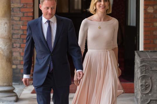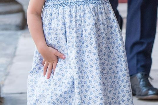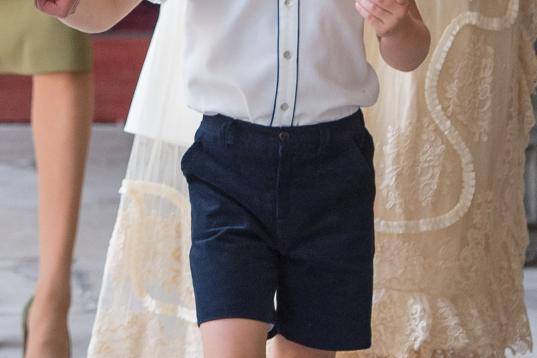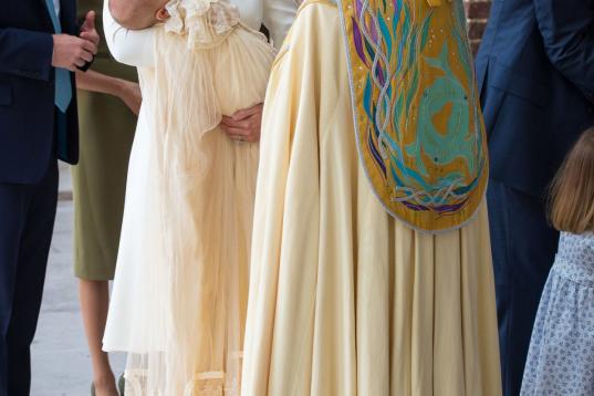 A ella ha llegado con su hijo dormido en brazos, que ha lucido un faldón de color crema —una réplica de las prenda de encaje hecha para la hija mayor de la reina Victoria, Victoria, en 1841— y al lado de su esposo, quien llevaba agarrados de cada mano a sus dos hijos mayores: el príncipe Jorge y la princesa Carlota, de cuatro y tres años respectivamente. Es la primera vez que se ve a los cinco miembros de la familia real británica juntos.