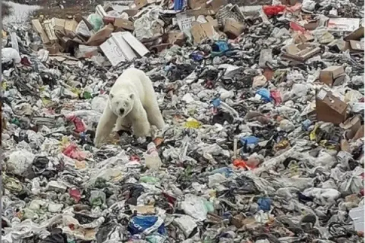 Oso Polar rebuscando comida en la basura vertida.