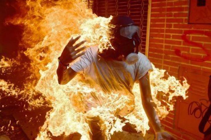• RONALDO SCHEMIDT via Getty Images Un manifestante, en llamas durante un enfrentamiento con los antidisturbios el 3 de mayo de 2017. Las protestas contra el presidente Nicolás Maduro llevan atormentando a Venezuela durante meses.