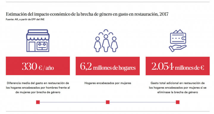 Si los 6,2 millones de hogares encabezados por mujeres realizan el mismo gasto en bares y restaurantes que el que hacen ellos, el gasto anual se elevaría en 2.054 millones de euros más, lo que representa el 0,2% del producto interior bruto de España. Si se eliminara esa brecha, se podrían crear 34.800 empleos y recaudar 1.130 millones de euros en impuestos como el IRPF y el IVA y en cotizaciones sociales.