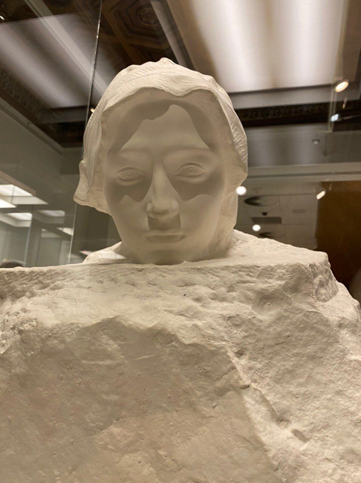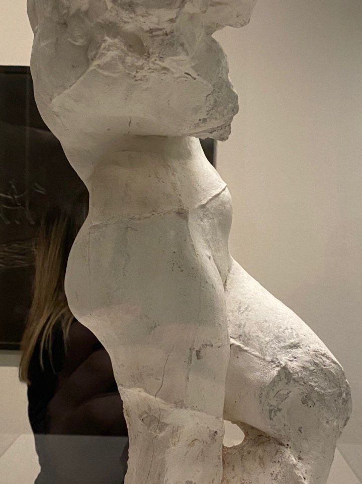 Y no podía no estar Camille Claudel, la artista y escultora ligada a la figura de Rodin por la relación desigual que se estableció entre ambos. No podemos evitar leer entre líneas al contemplar las obras de la exposición y recordar el sufrimiento que ella sentía, que desembocaría en la destrucción de su propio trabajo, su dolor, su vínculo cercano al que era su maestro y amante y las infidelidades de este que provocaron su caída. Una gran base en una de las esculturas deja aparecer una cabeza, un rostro alicaído, rendido, con la mirada perdida… Una Claudel enajenada, plásticamente rotunda, absoluta, y espiritualmente ausente.